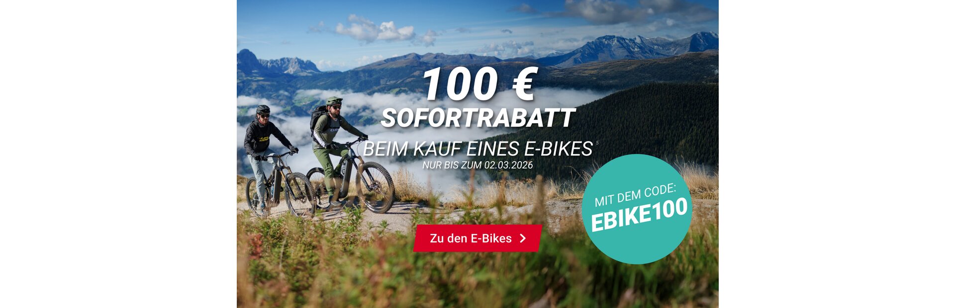EBIKE100: Der Gutschein EBIKE100 ist ausschließlich im Onlineshop fahrrad-xxl.de auf alle E-Bikes außer B-Ware gültig, pro Warenkorb einmal anwendbar, Aktionszeitraum: 20.02.2026 - 02.03.2026
