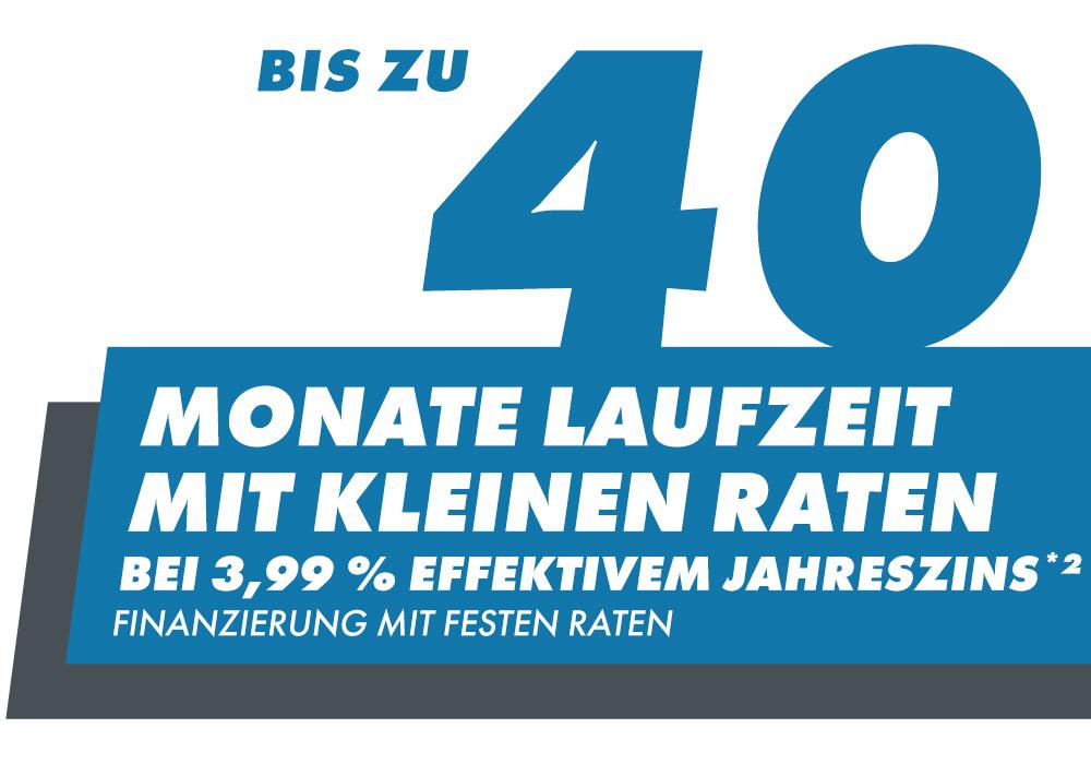 | *2: Kaufpreis entspricht dem Nettodarlehensbetrag; Gebundener Sollzinssatz (jährl.) 3,91%; effektiver Jahreszins 3,99%. Repräsentatives Beispiel i. S. d. § 6a Abs. 4 PAngV: Nettodarlehnsbetrag 2.000,00 € bei 40 Monatsraten à 53,41 €; | |